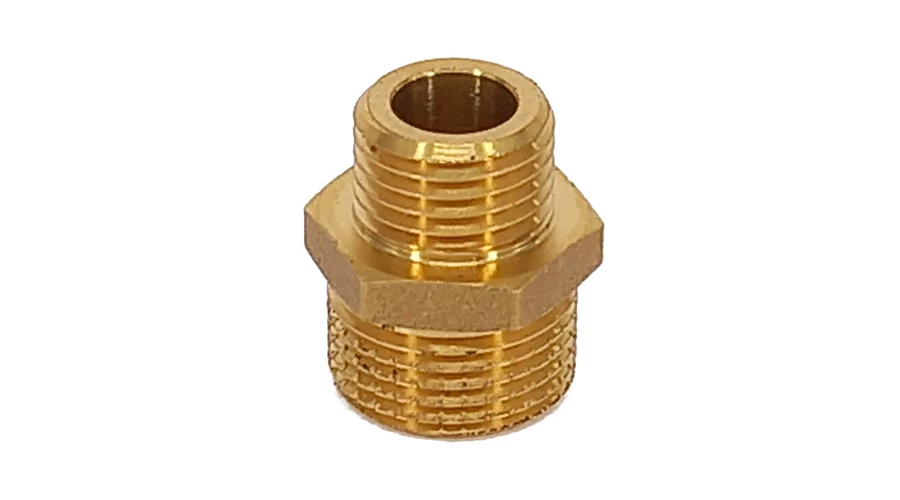Egyenes, külső menetes szűkítő közcsavar permetezőhöz. Anyag: Réz. Méret: 1/4"x3/8"